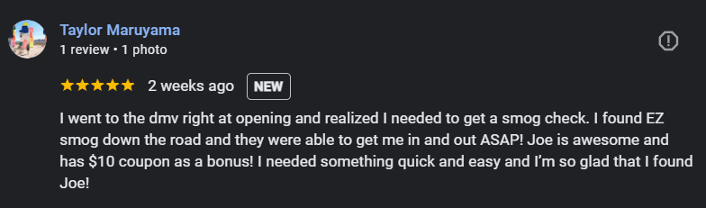 At EZ Smog Check, affordability goes hand-in-hand with professionalism. We always offer competitive pricing, and we make it easy to save money. By mentioning the coupon, Taylor reminds new customers that they can receive a $10 coupon towards their inspection, ensuring they get the best value in Torrance. You shouldn’t have to choose between fast service and a great price.