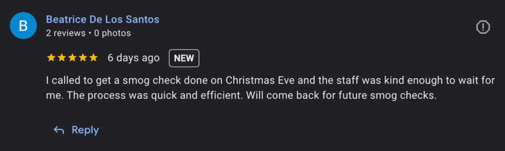One customer called EZ Smog Check on Christmas Eve needing a smog check. Despite the holiday, our staff was kind enough to wait and make sure the vehicle was tested. The process was quick, efficient, and stress free, exactly how a smog check should be. The customer left satisfied and confident enough to say they would return for future smog checks.